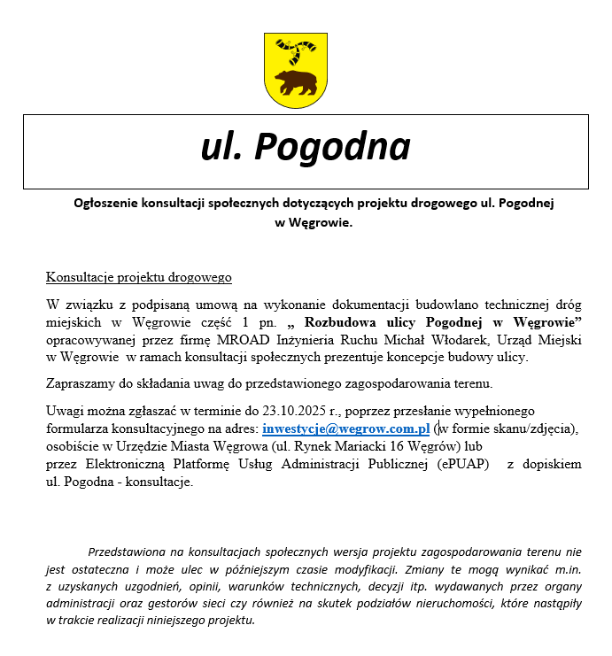 Ogłoszenie konsultacji społecznych dotyczących projektu drogowego ul. Pogodnej w WęgrowieWięcej informacji w załączeniu. |