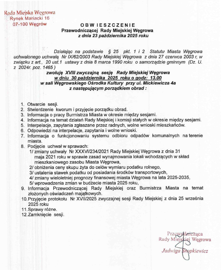XVIII zwyczajna sesja Rady Miejskiej WęgrowaArchiwum