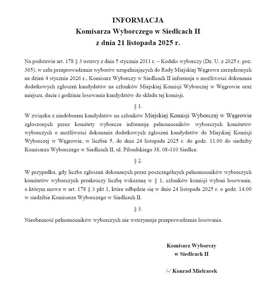 Informacja Komisarza Wyborczego w Siedlcach II o dodatkowych zgłoszeniach do Miejskiej Komisji Wyborczej w Węgrowie