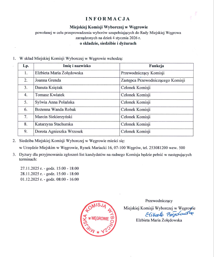 Informacja Miejskiej Komisji Wyborczej w Węgrowie o składzie, siedzibie i dyżurach.